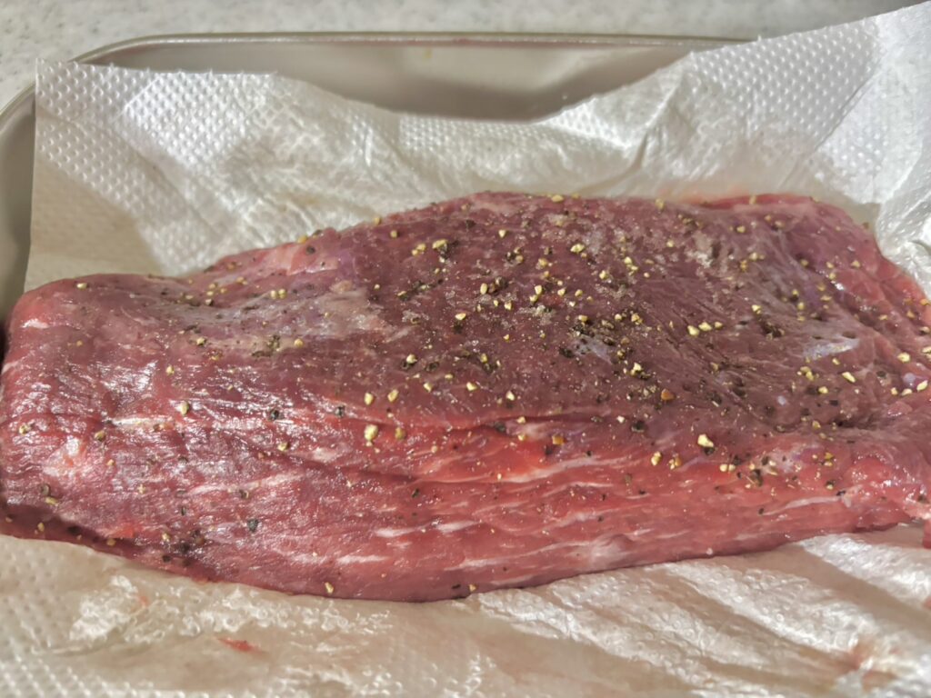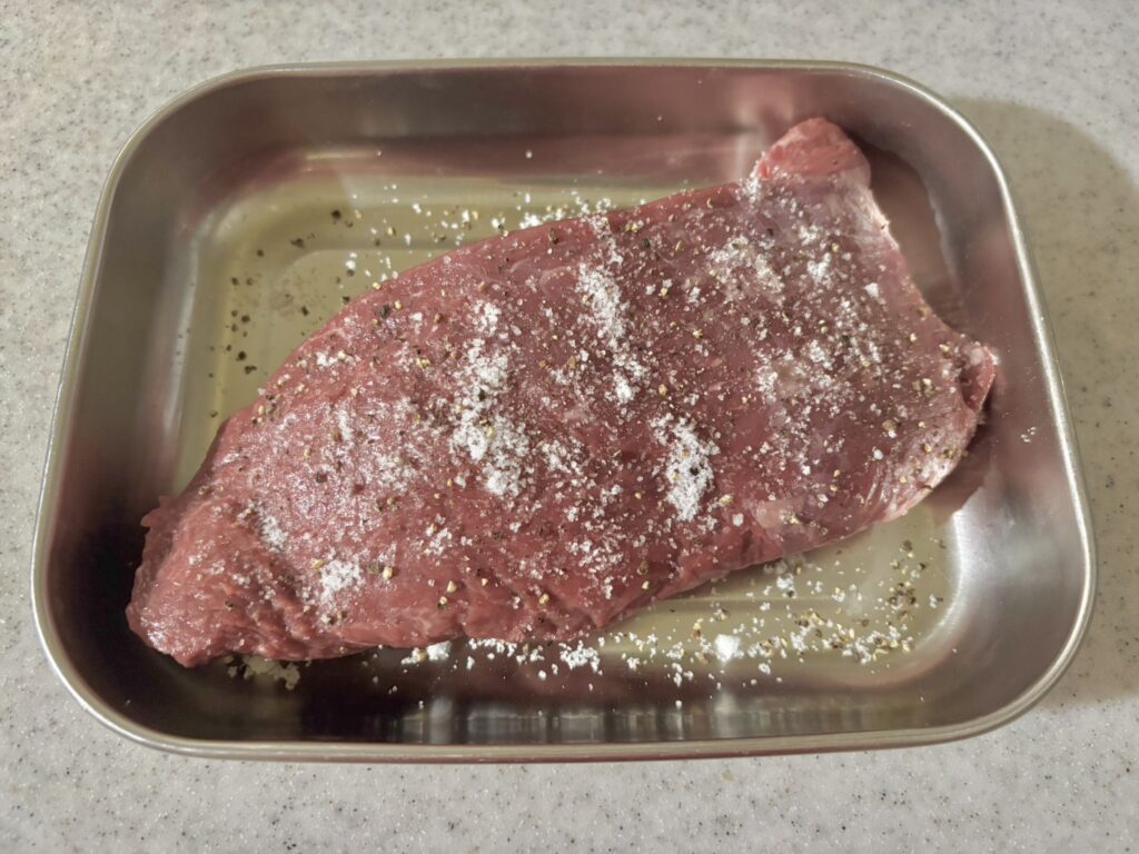 1. 牛モモブロックにしっかりと塩・コショウをし、20~30分常温で寝かす。