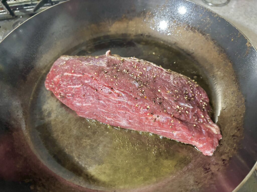 3. 熱したフライパンにオリーブオイルを引き、強火のまま表面をしっかり焼く