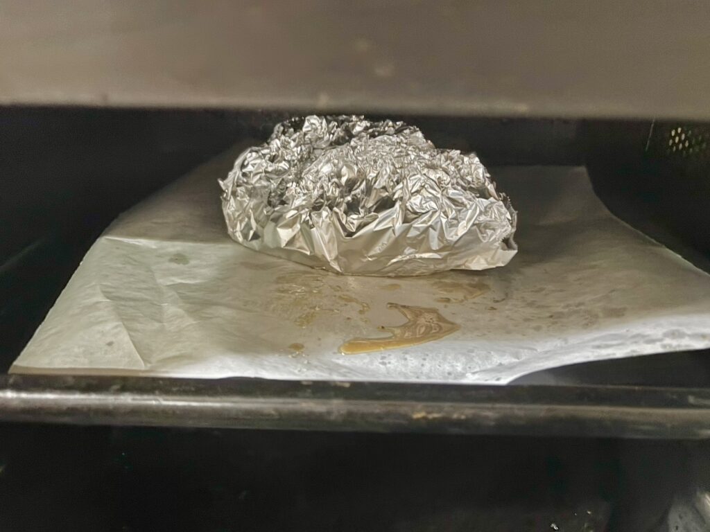 5. 焼きあがっても実際は芯まで焼けていないので、アルミホイルを巻き温かい所に置いて余熱で中まで火を通す。
