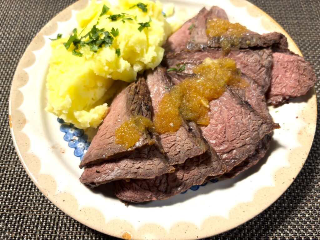 薄切りにして、たまねぎのソースと付け合せのマッシュポテトを添えて完成!