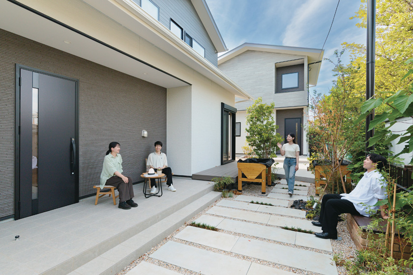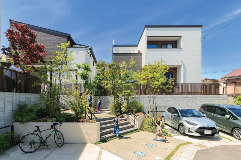 行き止まり道路に面し、高低差2m超の敷地に建つ3棟の分譲住宅。独立したエントランスを集約し、自然な交流が生まれる「つながりの踊り場」を創出しました。