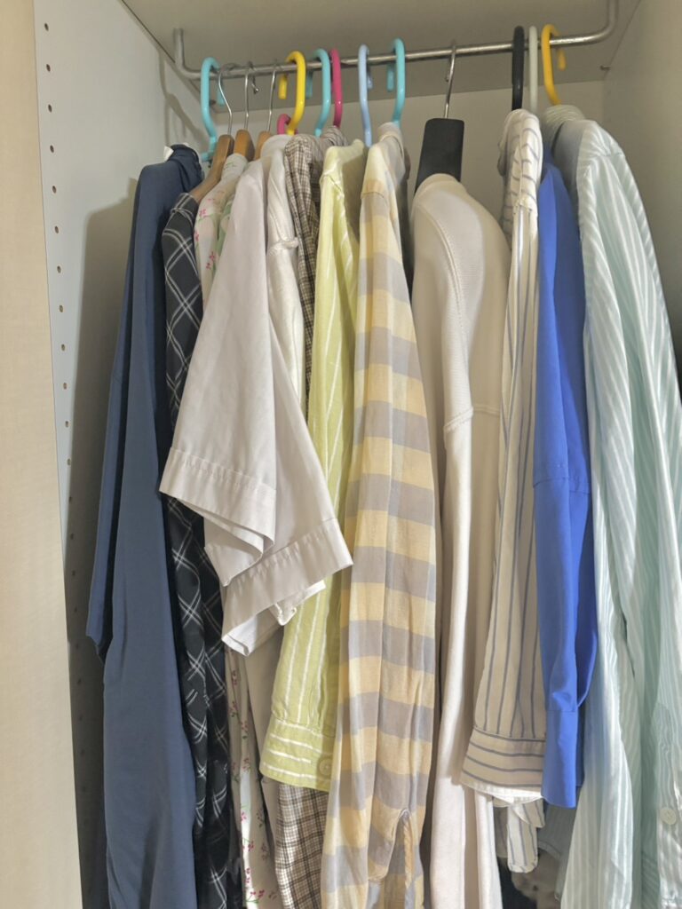 ハンガーの種類や色がごちゃごちゃで、服の種類もかなり混ざっています。この状態だと、見えづらい位置に隠れてしまう服がでてきてしまい、吊るしっぱなしのままくたびれてしまったりするんですよね……