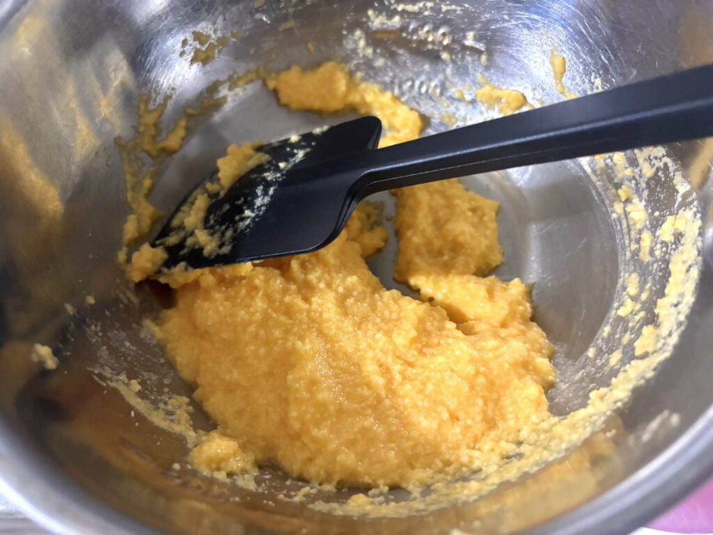 粉チーズ、卵、生クリームをよく混ぜてペースト状に。チーズが多いので、かなり重めのテクスチャーです。