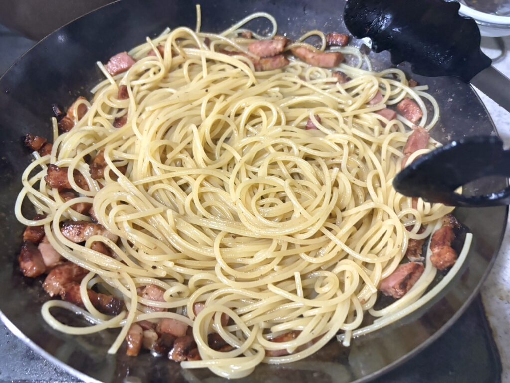 ⑤茹で上がったスパゲッティを火にかけた③のフライパンに入れ軽く塩味を加え整える。