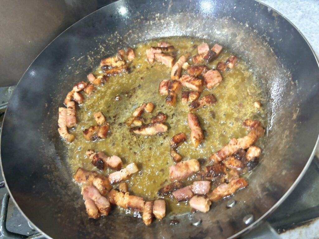 ②茹でている間にベーコンとオリーブオイルを火にかけ、オイルに旨みと風味を移す。